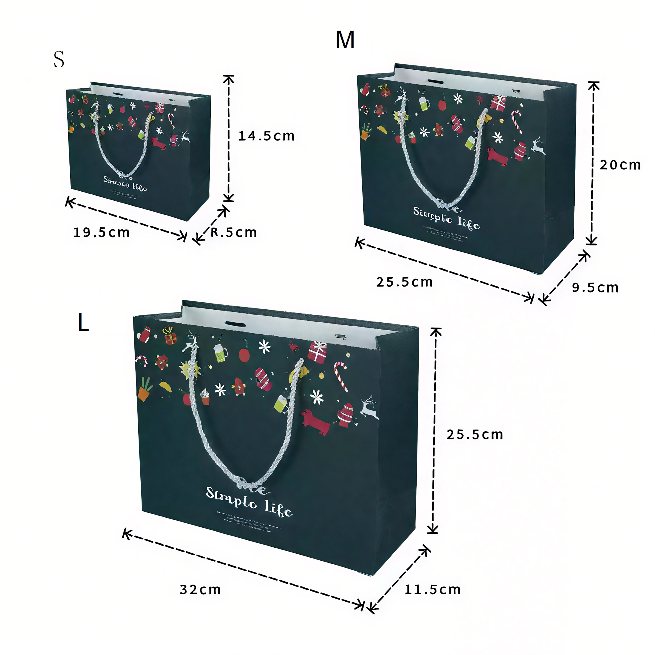 Размер может быть настроен в соответствии с размером подарка. Обычные размеры - маленькие (14,5 см × 19,5 см × 5 см), которые подходят для упаковки небольших подарков, таких как рождественские украшения и конфеты; обычные (20 см × 25,5 см × 9,5 см), которые могут вместить шарфы, перчатки, небольшие игрушки и т. д.; и увеличенные (25,5 см × 32 см × 11,5 см), которые можно использовать для упаковки одежды, больших кукол и т. д. Дизайн узора наполнен рождественской атмосферой. Классические элементы включают в себя рождественские елки, полные подарков, олени, тянущие сани, улыбающегося Санта-Клауса, летящие снежинки, мерцающие звезды и т. д. В то же время он поддерживает индивидуальную настройку и может включать эксклюзивные элементы, такие как корпоративные логотипы, благословения, личные подписи и т. д. Независимо от того, используется ли он в качестве упаковки для рекламных подарков на праздники бренда или в качестве индивидуального рождественского подарочного пакета, он может отражать уникальные мысли.